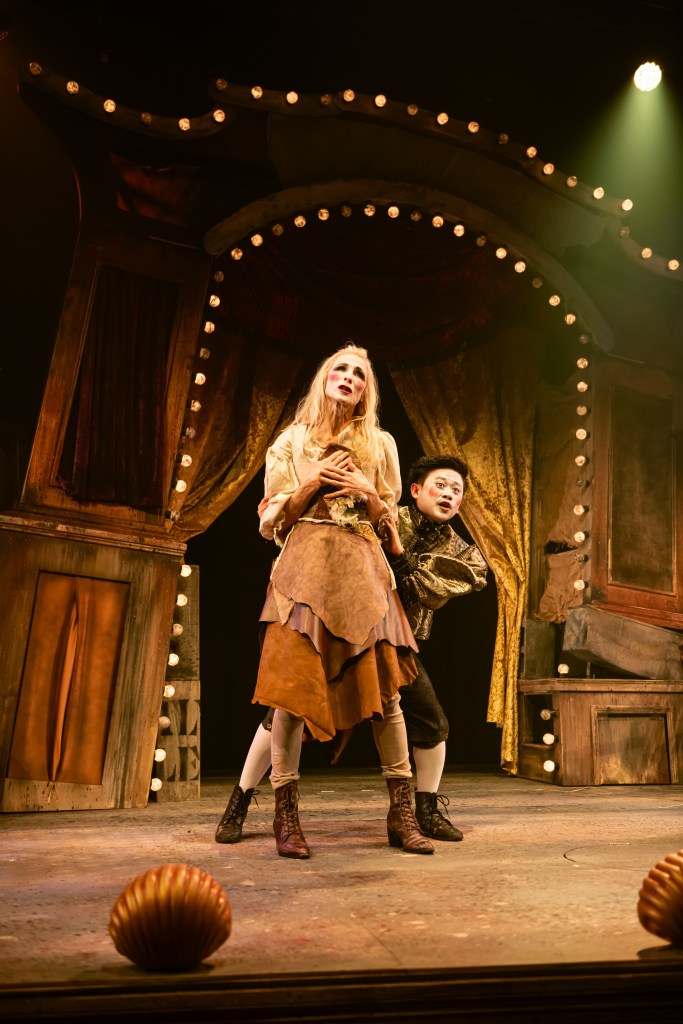 The production’s choreography by Dan Venz and fight direction by NJ Price ensure that the physical comedy and staged brawls are both meticulously crafted and entertaining. Brendan Maclean’s emcee performance as the wolf brings a cabaret vibe that’s both charming and sinister, while the portrayal of Hansel and Gretel’s lollipop moment and their fate at the hands of the wolf is a darkly humorous highlight.
