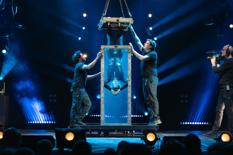 Italy’s master escape artist Andrew Basso followed with a routine packed with tension and comedy, involving handcuffs, a live scorpion held between his teeth, and a brave audience volunteer who, in her frantic attempt to help, accidentally slapped him—sending the audience into hysterics. Basso later escalated to a daring Houdini water torture chamber escape that left the room collectively holding its breath.